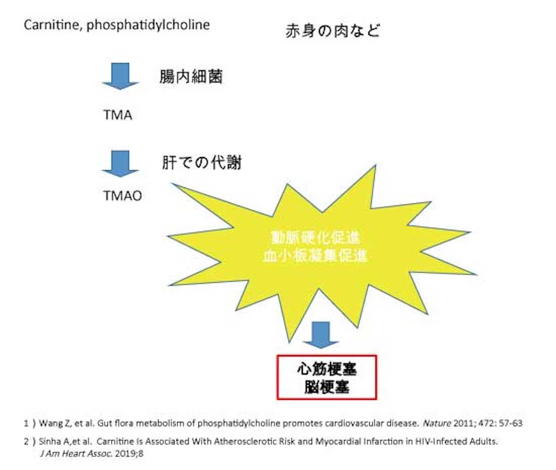 - 赤身の肉に多く含まれるcarnintineやphosphatidylcholineが腸内細菌で代謝され、さらに肝で酸化されてTMAOが生成する。
